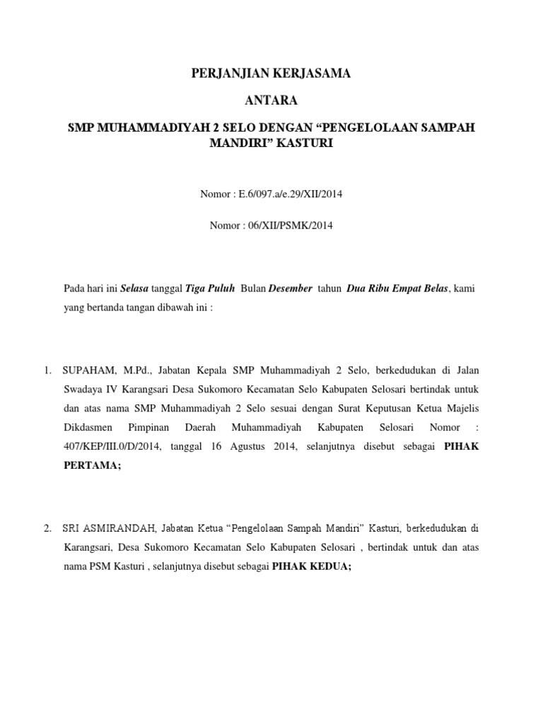 Surat perjanjian kerjasama pengambilan sampah Contoh Surat Perjanjian Kerjasama Pengelolaan Sampah Cute766