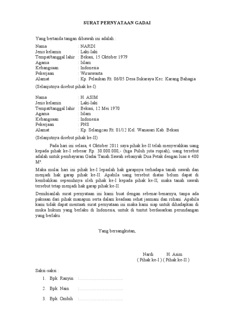 Surat perjanjian gadai sawah Surat Pernyataan Gadai